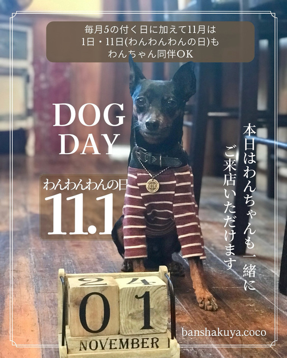 毎月⑤の付く日に加えて11月は1日・11日(わんわんわんの日)もわんちゃん同伴OK🐶♪