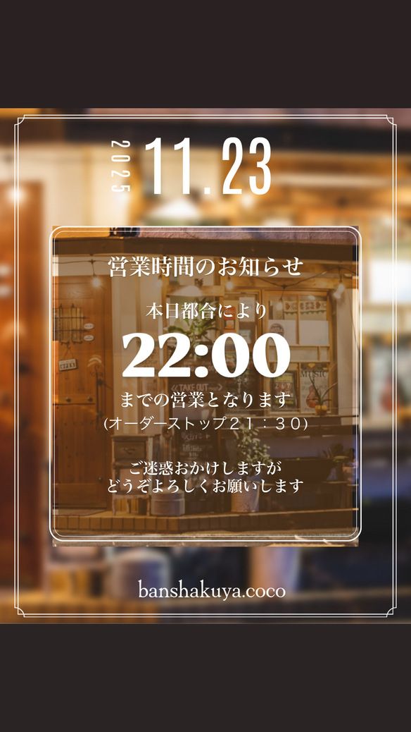 本日11月23日(日)は都合により22:00までの営業となりますm(_ _)m(オーダーストップ 21:30)